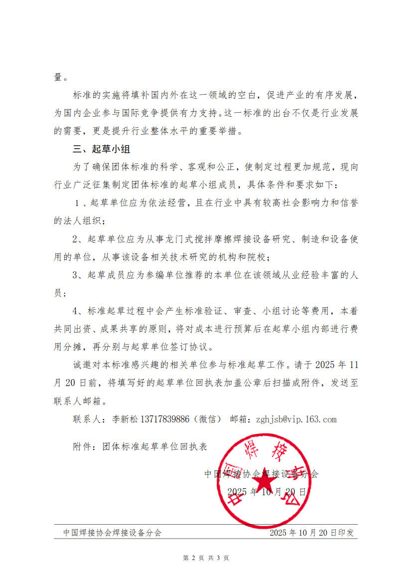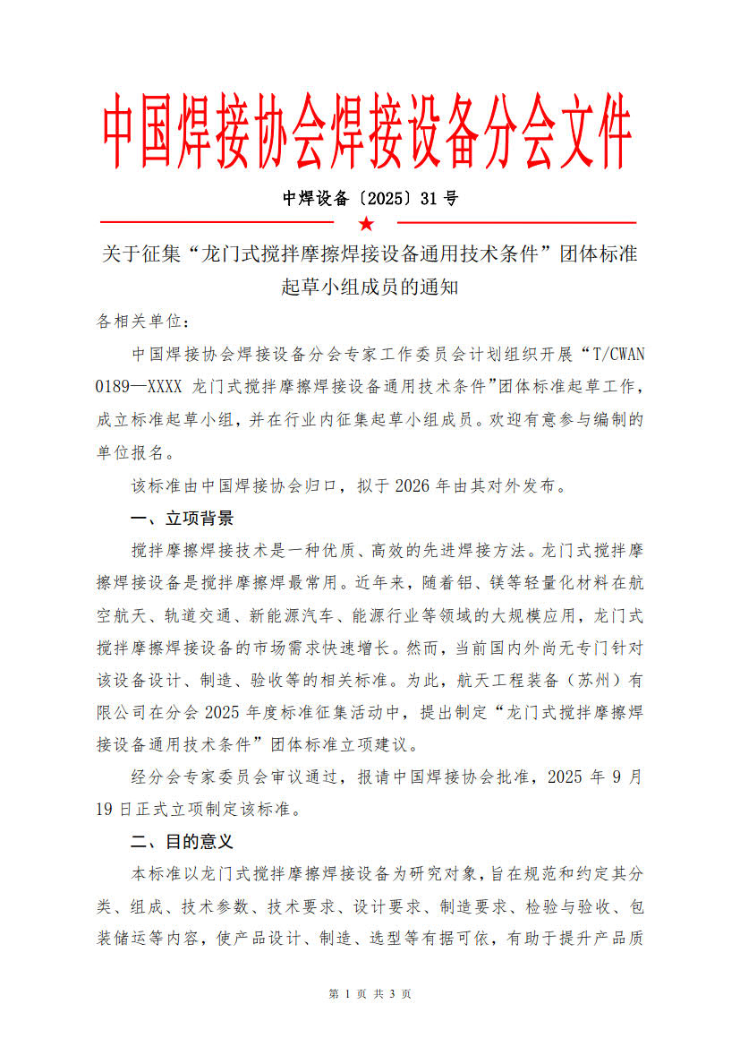 1、关于征集“龙门式搅拌摩擦焊接设备通用技术条件”团体标准 起草小组成员的通知