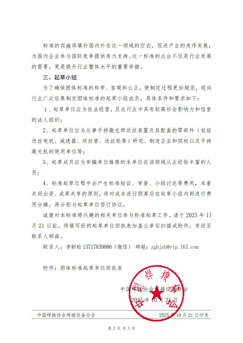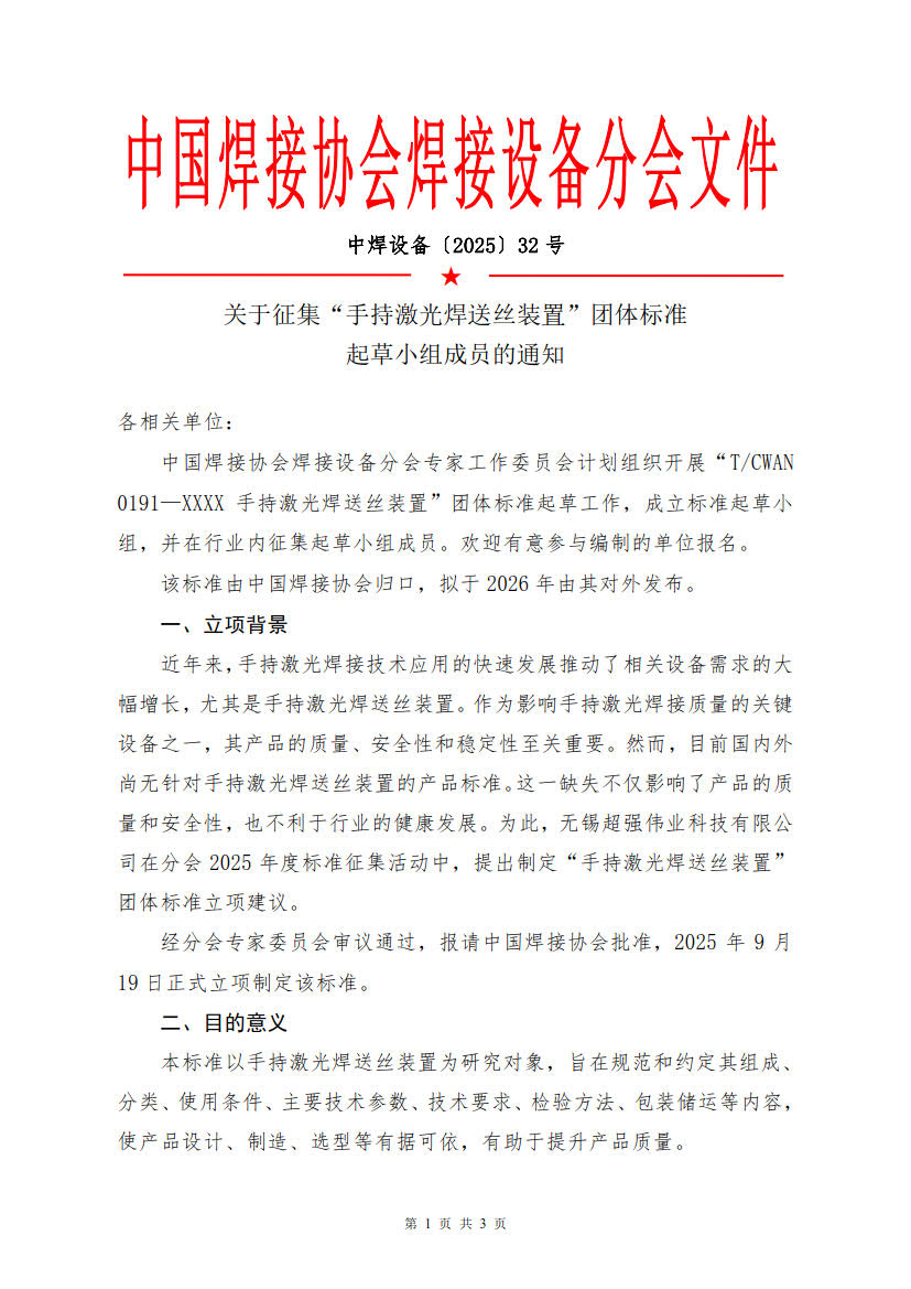 1、关于征集“手持激光焊送丝装置”团体标准起草小组成员的通知