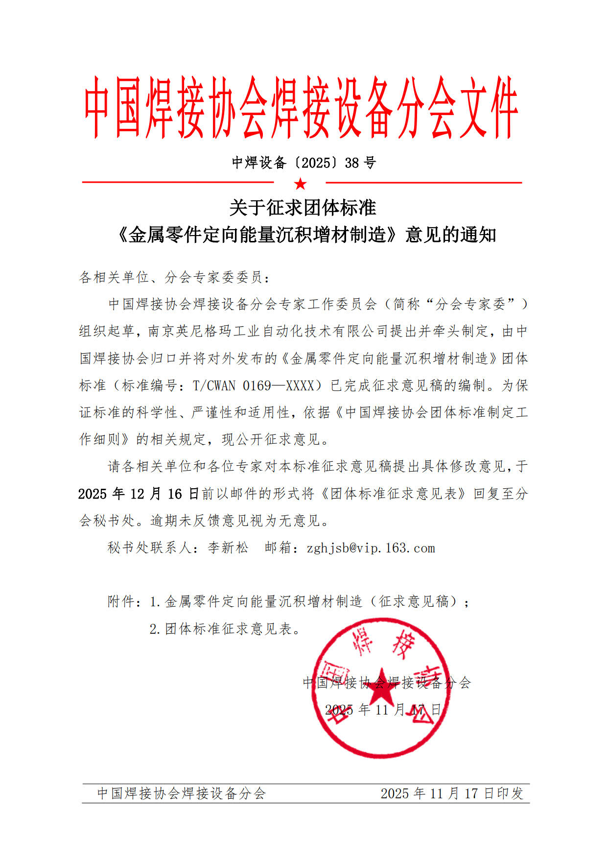 附件:1.关于征求团体标准《金属零件定向能量沉积增材制造》意见的通知2.金属零件定向能量沉积增材制造(征求意见稿)3.团体标准征求意见表