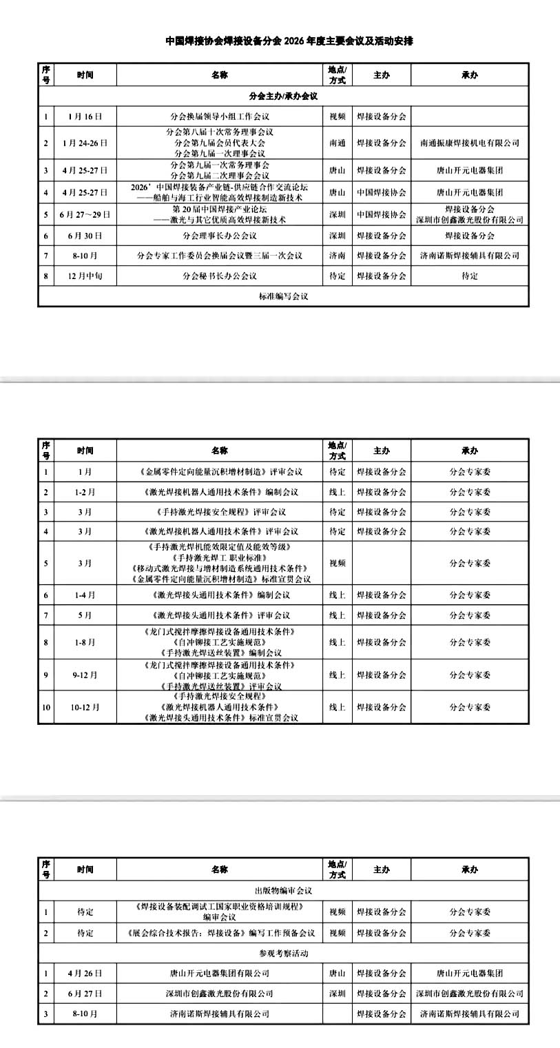 中国焊接协会焊接设备分会2026年度主要会议及活动安排