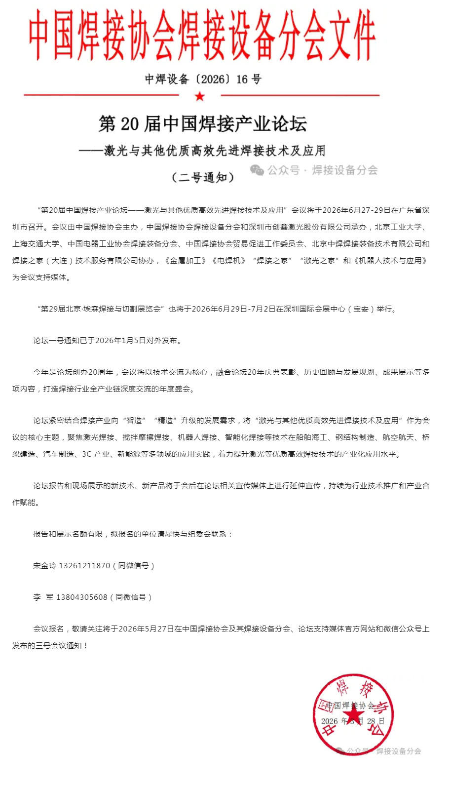 第20届中国焊接产业论坛——激光与其他优质高效先进焊接技术及应用(二号通知)